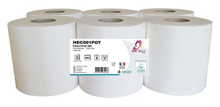 Rouleau super MAXI Dévidage Central Laize 18,4cm - 900 formats de 20cm Pure cellulose blanche 2 plis gaufré collé Ecolabel