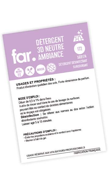 Produit d’entretien quotidien des sols. Laisse une odeur agréable grâce à la rémanence de son parfum.Bactéricide. Virucide. (voir au verso pour plus de détails)